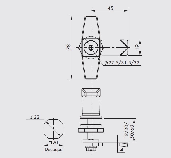 1/4 de vuelta - Cerradura completa con llave No.1333 - Asa en forma de T - Cuerpo 30mm