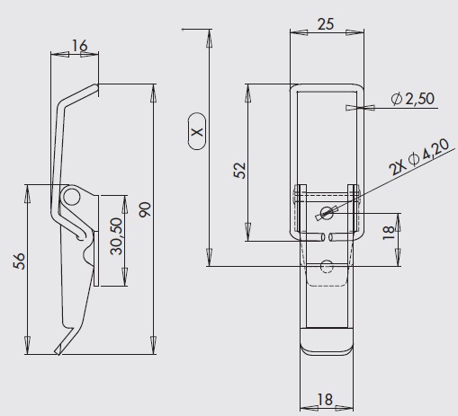 Pata de fijación : metal de 15/10e, 2 agujeros de Ø 4,2 mm (o sin perforación para soldadura)